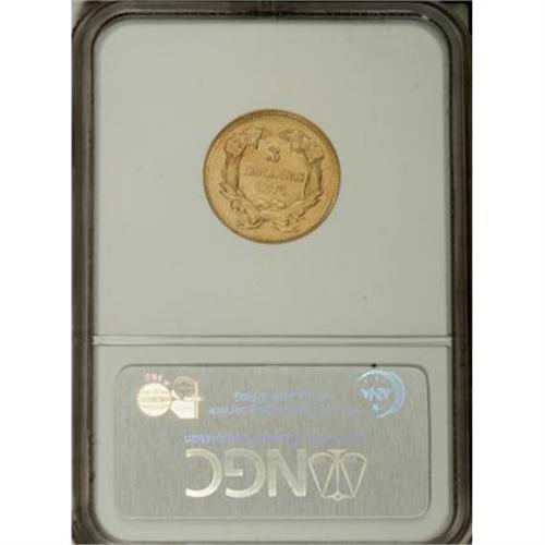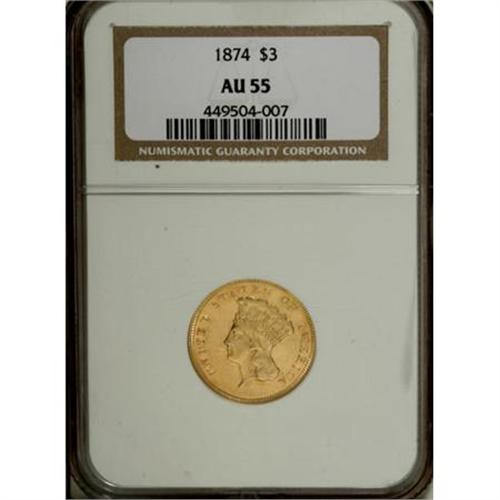 <B>1874 $3 AU55 NGC.</B></I> A well struck and still-lustrous example of this popular type issue, luminous with minor but distinct wear at the highpoints. Small, scattered marks are present in the lemon-gold fields.<BR><BR><B>Coin Engraver:</B> James B. Longacre<BR><BR><b>Shipping:</b> Coins & Currency (<a target="_blank" href="http://www.heritageauctions.com/common/shipping.php">view shipping information</a>)