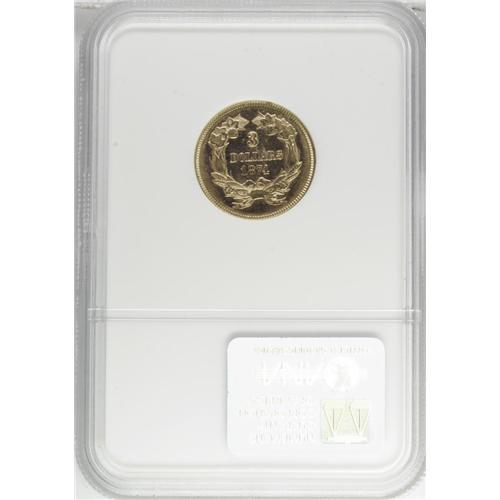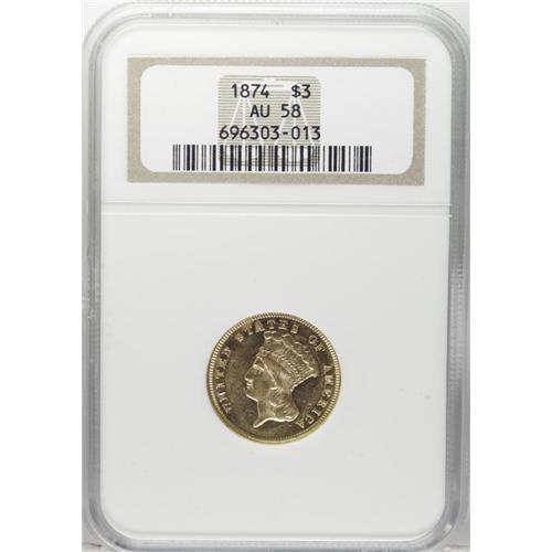 1874 $3 AU58 NGC. A common date of this popular, scarc