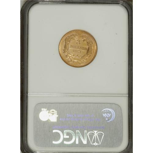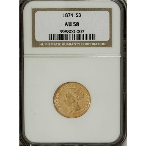 <B>1874 $3 AU58 NGC.</B></I> Strongly reflective with just a touch of friction on the highpoints. The yellow-gold surfaces display only a few tiny marks. This issue's mintage of 41,820 pieces was one of only two to reach five figures after the Civil War.<BR><BR><b>Shipping:</b> Coins & Currency (<a target="_blank" href="http://www.heritageauctions.com/common/shipping.php">view shipping information</a>)