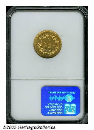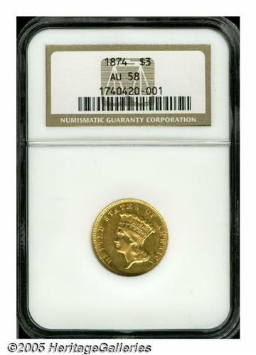 <B>1874<$3> AU58 NGC.</B></I> The average grade encountered for this issue is XF. The high-end AU specimen in this lot is sharply defined, with bright yellow-gold patina and considerable residual luster. The surfaces are remarkably clean, displaying no mentionable marks.