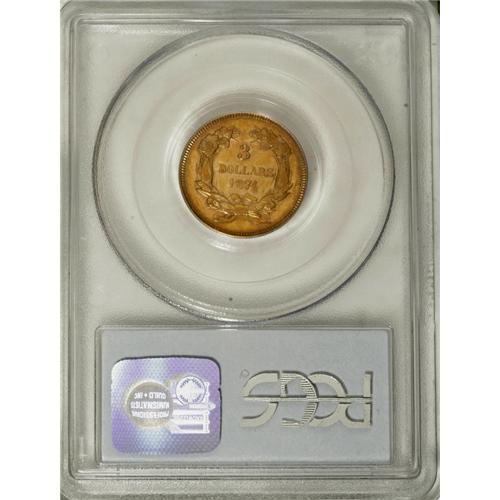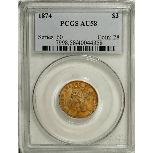 1874 $3 AU58 PCGS. The 1854, 1874, and 1878 three doll