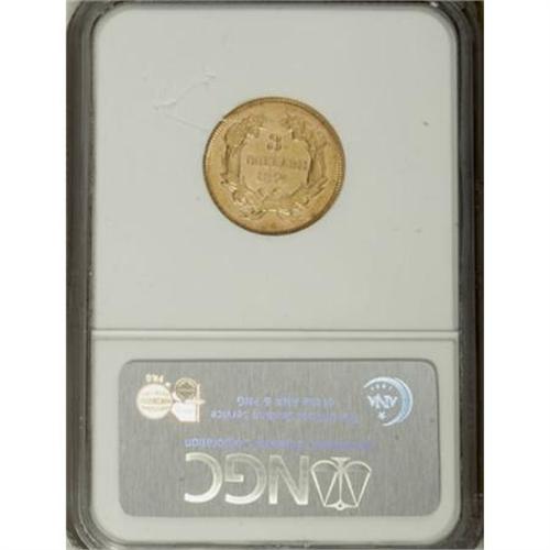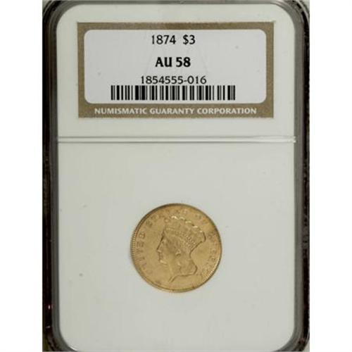 <B>1874 $3 AU58 PCGS.</B></I> The satin luster is nearly complete, and only a hint of friction on the design's high points separate this lovely piece from Mint State. Well struck except for the bow on the wreath, and free of individually noticeable surface marks. <BR><BR><b>Shipping:</b> Coins & Currency (<a target="_blank" href="http://www.heritageauctions.com/common/shipping.php">view shipping information</a>)