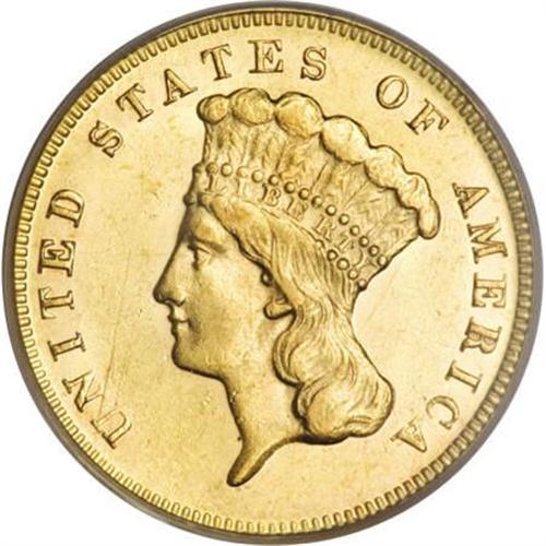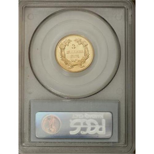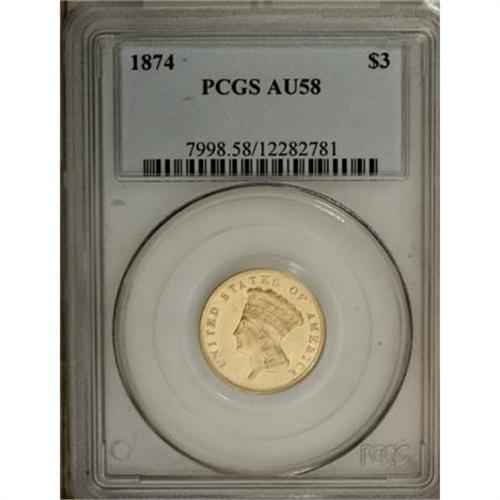 <B>1874 $3 AU58 PCGS.</B></I> The 1874 is a popular type coin for the series, with its mintage of 41,820 coins--one that in many other gold series would constitute a rarity. The surfaces are partially prooflike on this delectable yellow-gold piece, which reveals few distractions even under a loupe.<BR><BR><B>Coin Engraver:</B> James B. Longacre<BR><BR><b>Shipping:</b> Coins & Currency (<a target="_blank" href="http://www.heritageauctions.com/common/shipping.php">view shipping information</a>)