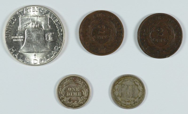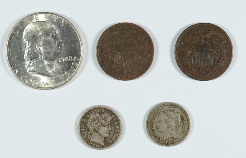 1874 3 CENT-XF, 1865 2 CENT-VF, 1948-D HALF $-BU, 1916-S DIME, 1864 2 CENT-XF