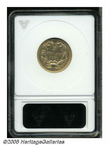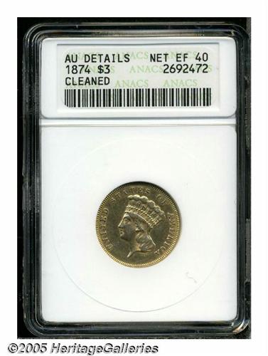 <B>1874<$3>--Cleaned--ANACS. AU Details, Net XF40.</B></I> A moderately hairlined piece with pleasing honey-tinged luster and no obtrusive marks. Among the more available dates in the series.