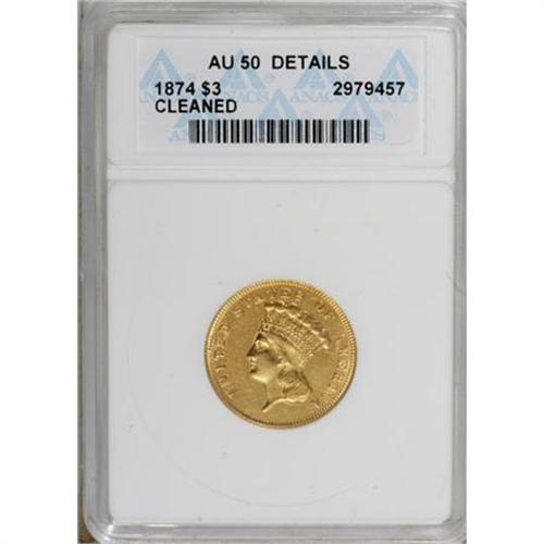 <B>1874 $3 --Cleaned--ANACS. AU50 Details.</B></I> NGC Census: (69/1802). PCGS Population (140/1299). Mintage: 41,820. Numismedia Wsl. Price for NGC/PCGS coin in AU50: $1,210. (#7998)<BR><BR><b>Shipping:</b> Coins & Currency (<a target="_blank" href="http://www.heritageauctions.com/common/shipping.php">view shipping information</a>)