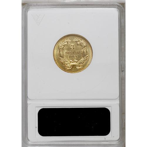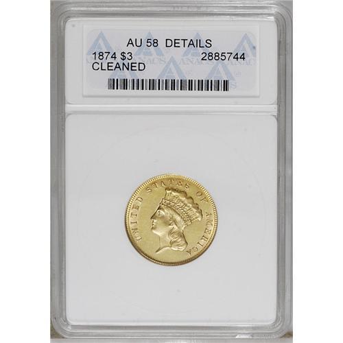 <B>1874<$3>--Cleaned--ANACS. AU58 Details.</B></I> Most of the natural luster has been replaced by uniform brightness. Just a trace of friction appears on the highpoints of this well struck yellow-gold piece.