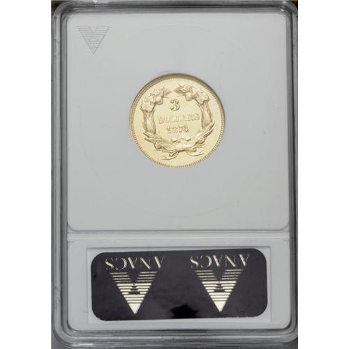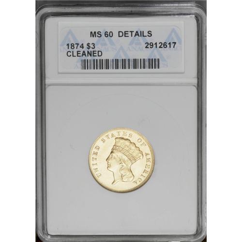 <B>1874 $3 --Cleaned--ANACS. MS60 Details.</B></I> This yellow-gold piece has no trace of wear and significant luster remains on the surfaces. The fields, however, are suspiciously bright and hairlined.<BR><BR><b>Shipping:</b> Coin/Currency (<a target="_blank" href="http://www.heritageauctions.com/common/shipping.php">view shipping information</a>)