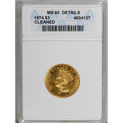 <B>1874 $3 --Cleaned--ANACS. MS60 Details.</B></I> This unworn type piece is pleasingly detailed overall, though the knot of the bow shows slight softness and roughness. The unnaturally reflective yellow-gold surfaces show numerous faint flaws.<BR><BR><B>Coin Engraver:</B> James B. Longacre<BR><BR><b>Shipping:</b> Coins & Currency (<a target="_blank" href="http://www.heritageauctions.com/common/shipping.php">view shipping information</a>)