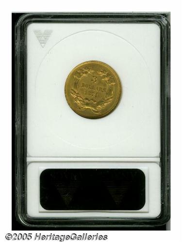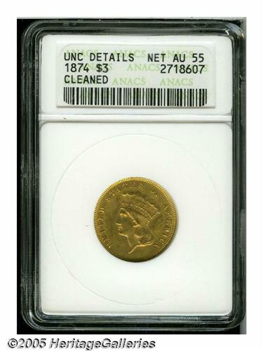 <B>1874<$3>--Cleaned--ANACS. Unc Details, Net AU55.</B></I> A lustrous and bold Three Dollar Gold piece that is slightly bright from a past wipe from a jeweler's cloth.<BR><I>From the Dr. Kurt Peters Collection.</B></I> From the Dr. Kurt Peters Collection.