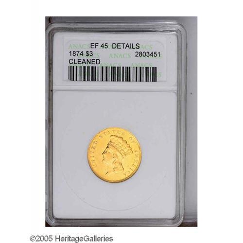 1874 $3 --Cleaned--ANACS. XF45 Details. Bright yellow-g 1874[$3]--Cleaned--ANACS. XF45 Details.