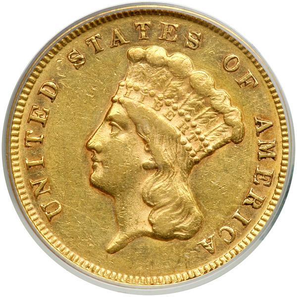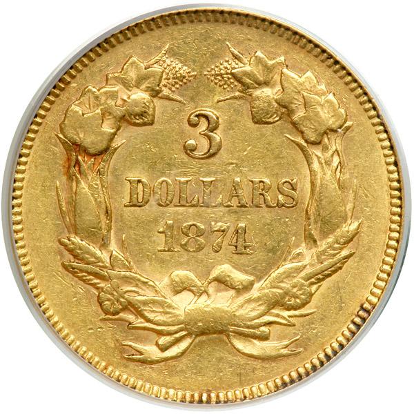 1874. PCGS graded AU-50 CAC Approved. Lightly toned with traces of semi reflective mint luster within the protected areas. Three dates only in this series are considered as common, 1854, 1874, and 1878 (PCGS # 7998) .