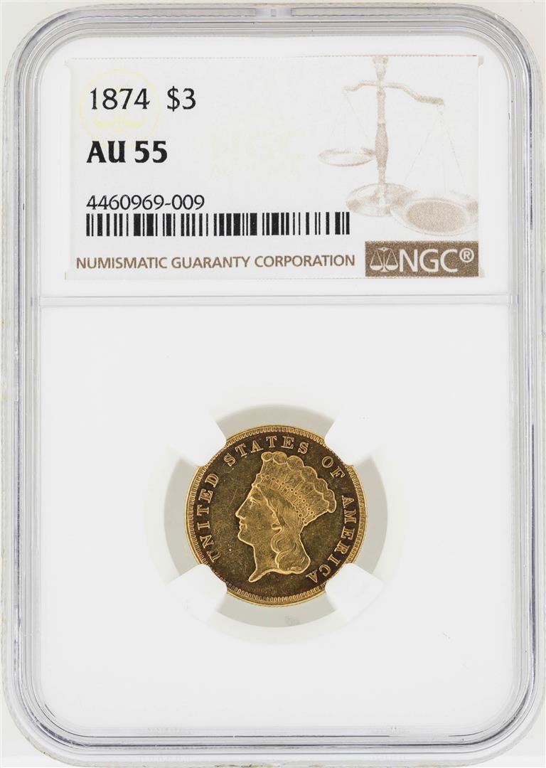 One 1874 $3 Indian Princess Head Gold Coin NGC AU55. NGC Certified.