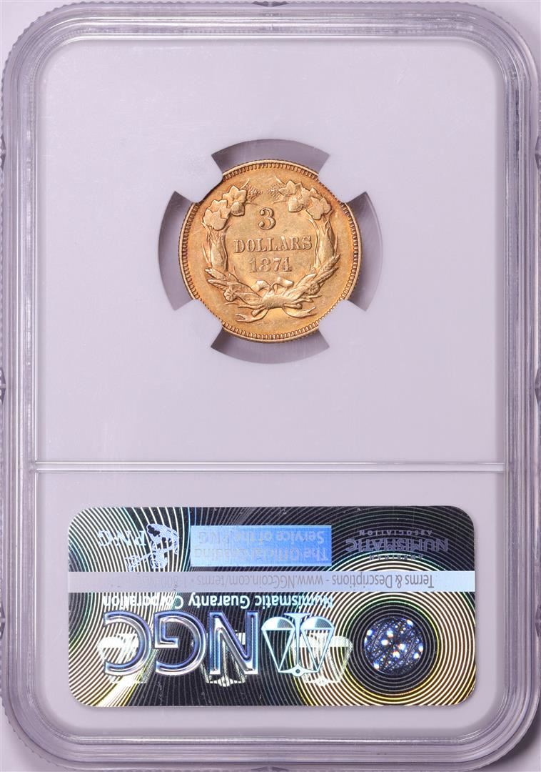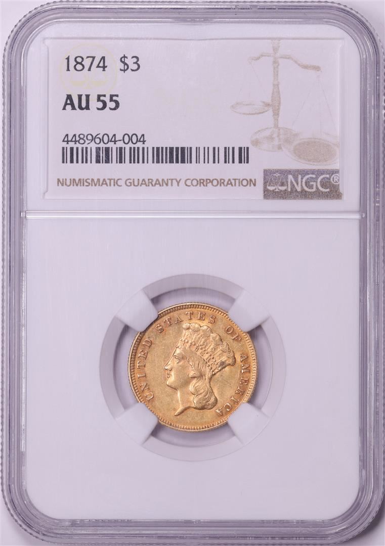 One 1874 $3 Indian Princess Head Gold Coin NGC AU55. NGC Certified.