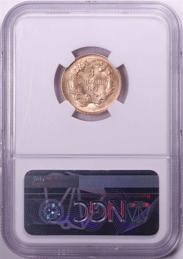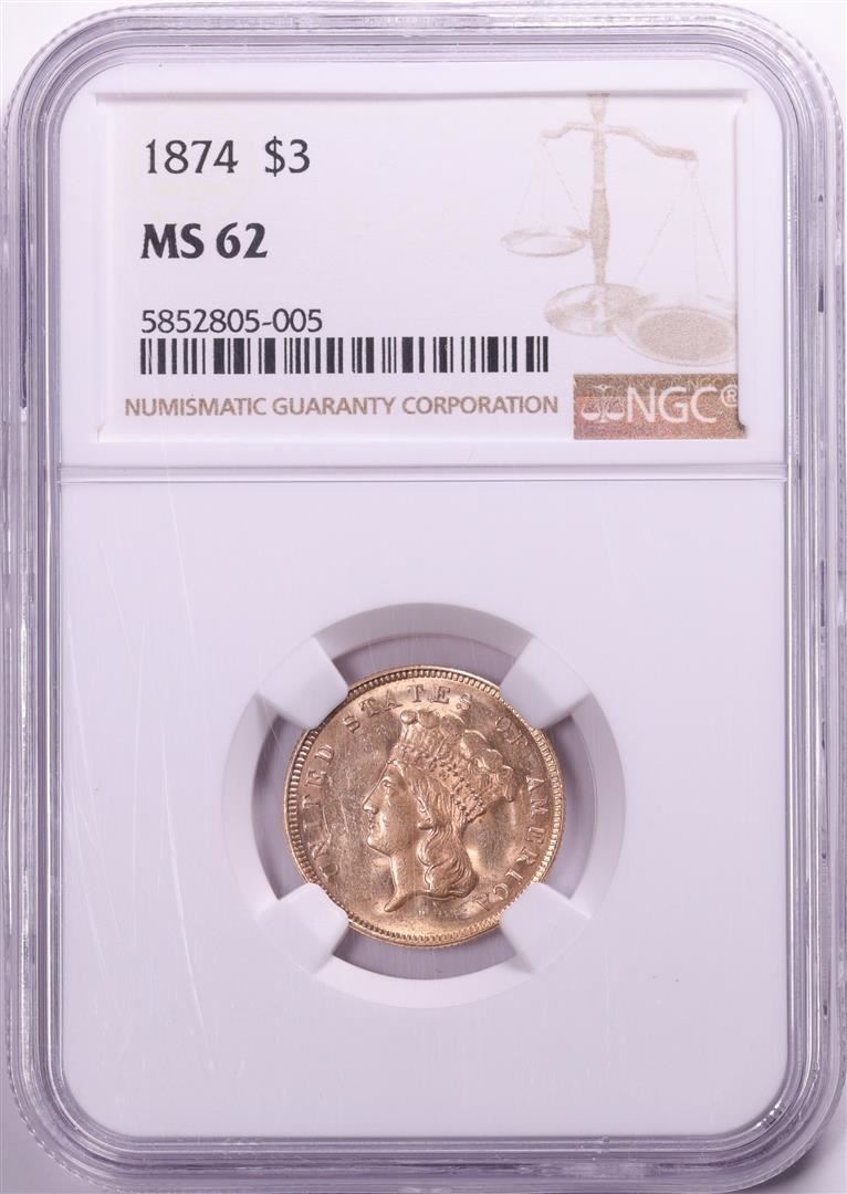 One 1874 $3 Indian Princess Head Gold Coin NGC MS62. NGC Certified.