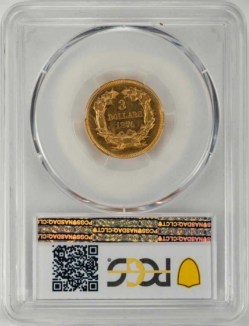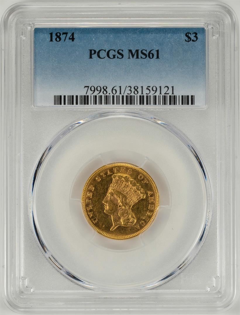 One 1874 $3 Indian Princess Head Gold Coin PCGS MS61. PCGS Graded.
