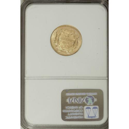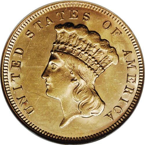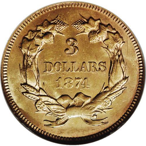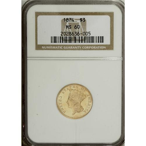 <B>1874 $3 MS60 NGC.</B></I> Strong luster and considerable eye appeal characterize this common, late-date three dollar. The strike is a bit soft on the highest portions of the design, but this is a minor concern. There is a rich golden tinge to the luster that gives the piece an attractive appearance on each side. Minimally marked; a few thin scratches on and near the obverse portrait limit the grade.<BR><I>From The Monedas Oro Collection.</B></I><BR><BR><b>Shipping:</b> Coin/Currency (<a target="_blank" href="http://www.heritageauctions.com/common/shipping.php">view shipping information</a>)
