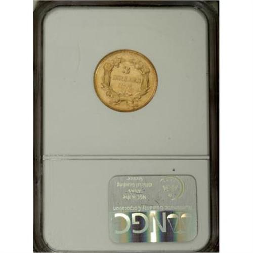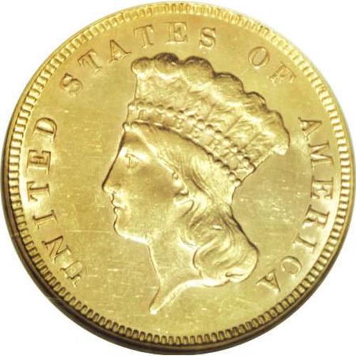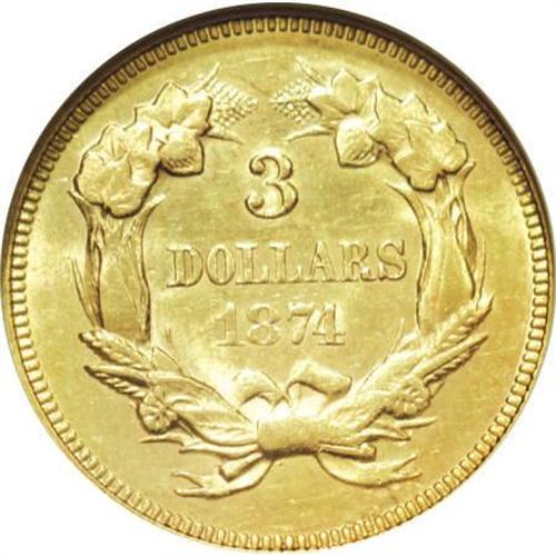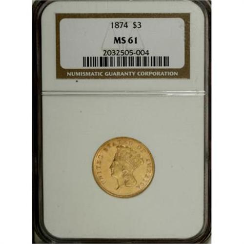<B>1874 $3 MS61 NGC.</B></I> Bright, lustrous canary-gold fields show a few scattered abrasions consistent with the grade, but much eye appeal remains on this piece. An interesting series of small planchet laminations beneath the right (facing) ribbon bow appear to be as made. A nice and attractive coin for the grade.<BR><BR><B>Coin Engraver:</B> James B. Longacre<BR><BR><b>Shipping:</b> Coins & Currency (<a target="_blank" href="http://www.heritageauctions.com/common/shipping.php">view shipping information</a>)