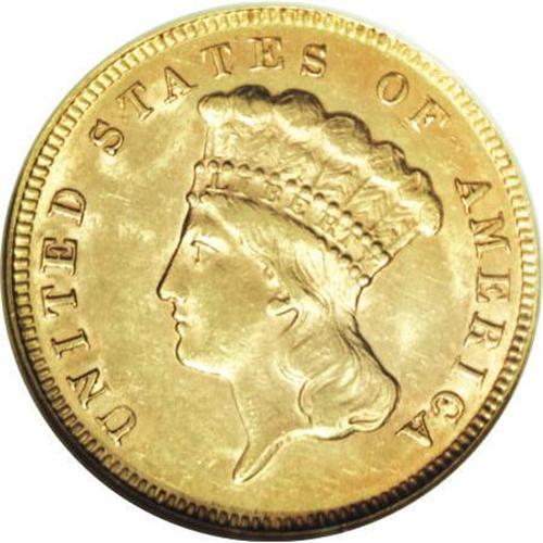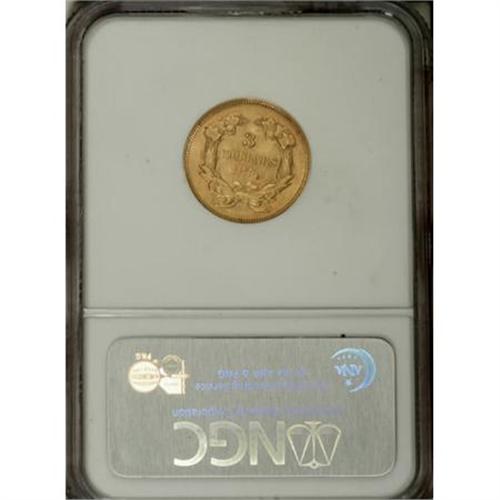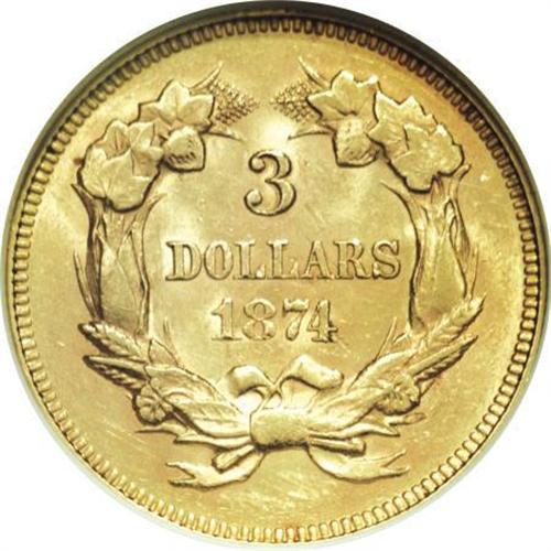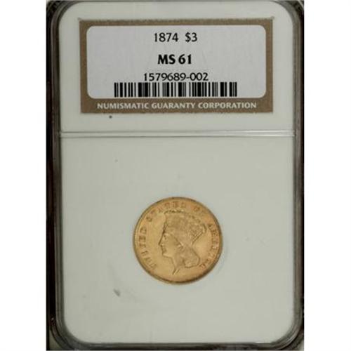 <B>1874 $3 MS61 NGC.</B></I> Areas of reddish-gold predominate near the peripheries, with greenish-gold in the centers on this delightful Mint State piece, which presents as significantly better than the numeric grade might suggest. There are a couple of small scrapes on the reverse, but elsewhere there are no individually significant abrasions noted. A nice coin for the grade.<BR><BR><B>Coin Engraver:</B> James B. Longacre<BR><BR><b>Shipping:</b> Coins & Currency (<a target="_blank" href="http://www.heritageauctions.com/common/shipping.php">view shipping information</a>)