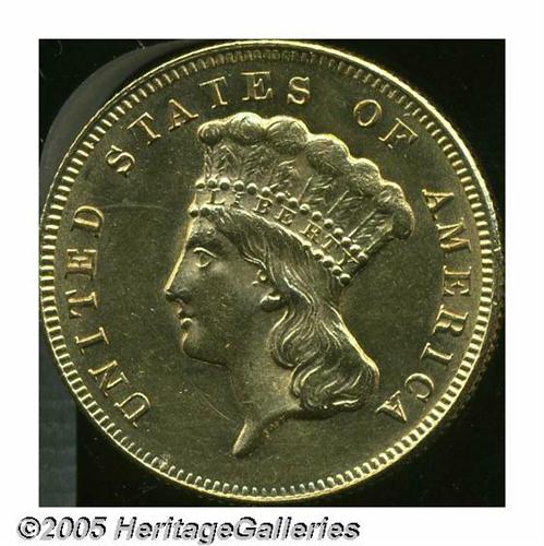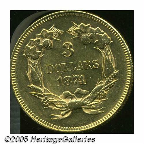 <B>1874<$3> MS62 Brushed Uncertified.</B></I> Well struck and fully lustrous, with lovely pink and yellow-gold toning and generally mark-free surfaces. A patch of wispy lines, on the upper left obverse field, are the result of "brushing."