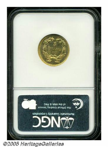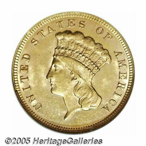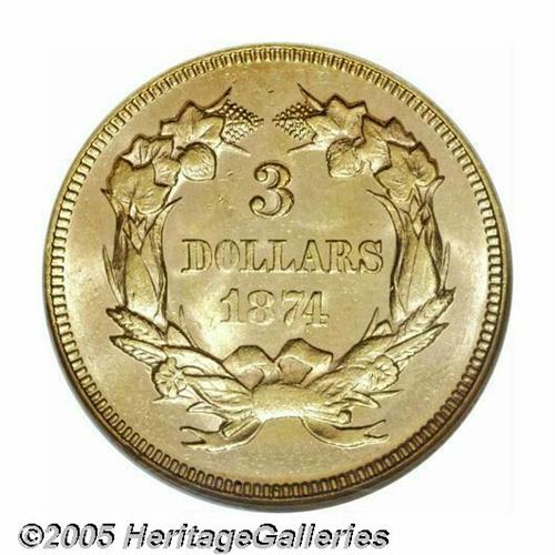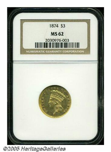 <B>1874<$3> MS62 NGC.</B></I> Fully lustrous with excellent satiny surfaces and only a few tiny marks to prevent a higher grade. The tips of the feathers on the obverse and the ribbon on the reverse are indistinct, with all other design details more sharply defined. Mintage for the year totaled 41,820 coins, third highest of the denomination. Only 1854 and 1878 had higher production totals. Due to the mintage, this is considered one of the common dates, although there really is no such thing as a common Three-Dollar gold piece.