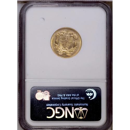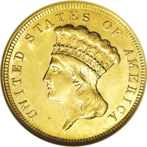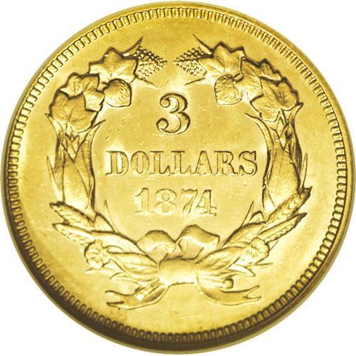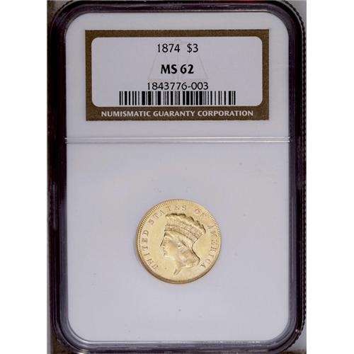 <B>1874<$3> MS62 NGC.</B></I> This popular type coin displays shimmering luster and faintly prooflike fields. Attractive yellow-gold patina bathes each side, and the design features are sharply impressed. A shallow linear abrasion is noted on Liberty's cheek, and some wispy slide marks are seen on the cheek and in the obverse fields. An attractive piece for the grade.