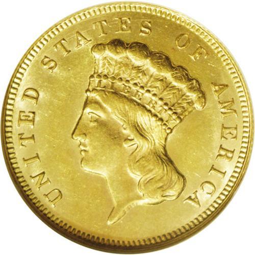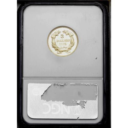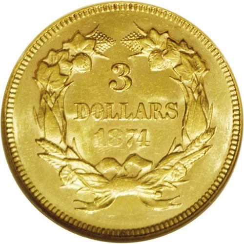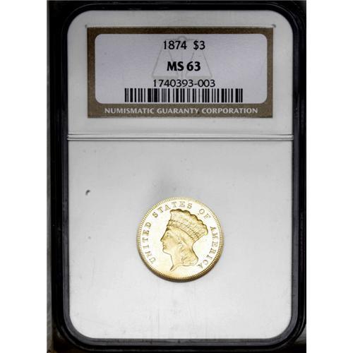 <B>1874<$3> MS63 NGC.</B></I> Average or better sharpness for this more obtainable issue, with bright yellow-gold surfaces and a few light, inoffensive abrasions on the reverse. A popular date in Mint State grades due to the overall scarcity of the type. <BR><BR><B>Important notice:</B> Heritage usually auctions material at the rate of 200-250 lots per hour. On some occasions eBay Live bid software or the Internet may not be able to keep up with the pace of the auction. We recommend placing a realistic absentee bid now as insurance to avoid disappointment. Occasionally the auctioneer may eliminate or reject an eBay Live bid, and the auctioneer may also reopen a lot after the close of the eBay live bidding (usually because we missed an audience bid), and may reject your bid even if it shows you as the winning bidder. By bidding via eBay Live, you agree that Heritage may award the lot to another bidder at its sole discretion under the circumstances described above or any other reasonable circumstances. Since eBay bids are not shown to us until we open the lot on the floor, we treat those bids just like floor bids. In most cases the floor responds before the eBay bid is presented to us, due to Internet lag time, so for consistency we have made it a policy that floor bids are always considered first over tie eBay live bids. Also please note that all Heritage lots purchased through eBay Live carry a 20% Buyer's Premium. Please make sure you read the Terms and Conditions before you bid. This lot is being auctioned in conjunction with a live floor auction by Heritage Galleries & Auctioneers. All final auction and invoice information will be supplied by Heritage Galleries & Auctioneers, and all other information should be considered preliminary. Lot:2590 <BR><BR><B>Winning Notification and Billing:</B> After the FINAL session in this auction is complete, Heritage will send e-mail and snail mail invoices. This process normally takes several days. All final auction and invoice information will be supplied by Heritage Galleries & Auctioneers, and all other information should be considered preliminary. <BR><BR>This auction will be conducted on a live auction floor and over the Internet through eBay Live. If you choose to place an absentee bid, please take a moment to <font color='#0000ff'><u><a href='http://pages.ebay.com/liveauctions/help/before/laabsentee.html'>learn how eBay Live absentee bidding works</a></u></font><font color='#000000'>