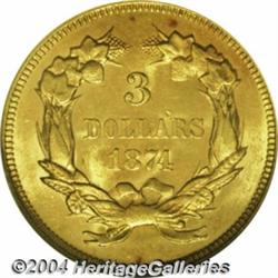 <table><tr><td><table><tr><td>1874 $3 MS63 NGC. Hues of deep golden-orange patina overlay the lightly marked surfaces and the well defined devices. Select quality throughout. <BR><BR><B>Important notice:</B> Heritage usually auctions material at the rate of 200-250 lots per hour. On some occasions eBay Live bid software or the Internet may not be able to keep up with the pace of the auction. We recommend placing a realistic absentee bid now as insurance to avoid disappointment. Occasionally the auctioneer may eliminate or reject an eBay Live bid, and the auctioneer may also reopen a lot after the close of the eBay live bidding (usually because we missed an audience bid), and may reject your bid even if it shows you as the winning bidder. By bidding via eBay Live, you agree that Heritage may award the lot to another bidder at its sole discretion under the circumstances described above or any other reasonable circumstances. Since eBay bids are not shown to us until we open the lot on the floor, we treat those bids just like floor bids. In most cases the floor responds before the eBay bid is presented to us, due to Internet lag time, so for consistency we have made it a policy that floor bids are always considered first over tie eBay live bids. Also please note that all Heritage lots purchased through eBay Live carry a 20% Buyer's Premium. Please make sure you read the Terms and Conditions before you bid. <BR><BR><B>IMPORTANT ANNOUNCEMENT ABOUT RESERVES:</B> Heritage now divulges all reserves on its web site 7 days before every auction. If you want to know whether the reserve on this lot has been met, and if not, what the reserve amount is, please visit this lot page on the HeritageCoin.com web site, or email: bid@HeritageGalleries.com </span></font></td></tr></table></td></tr></table>