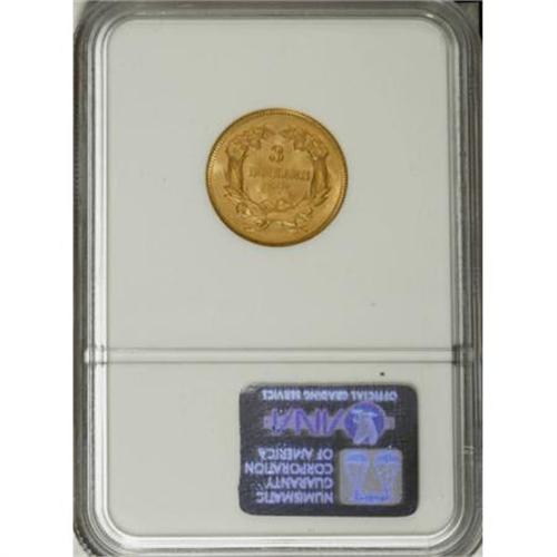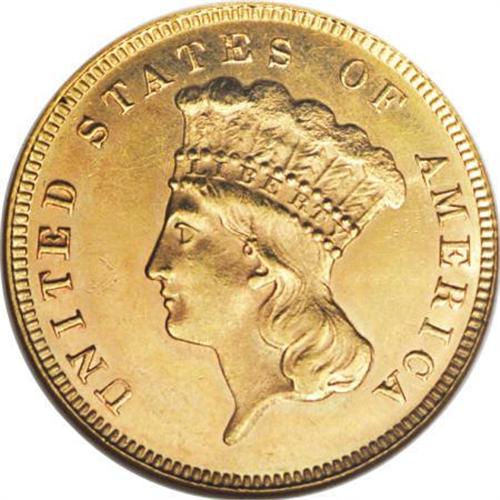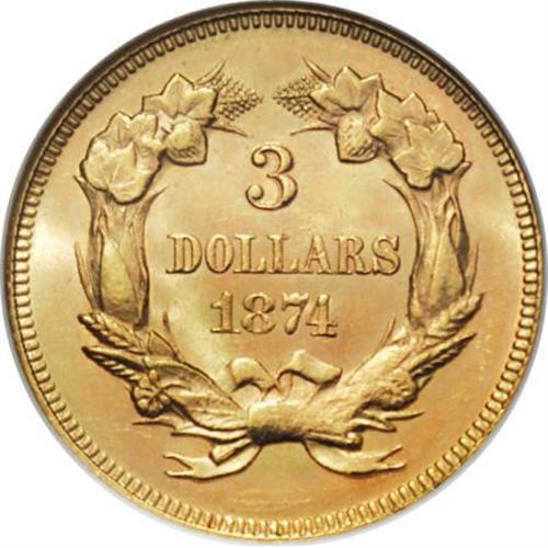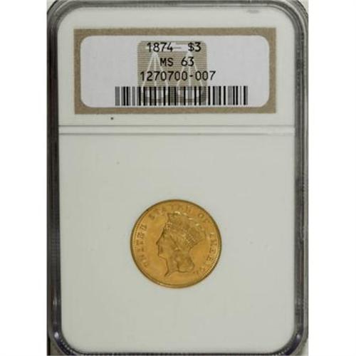 <B>1874 $3 MS63 NGC.</B></I> As the third highest mintage three dollar gold piece, the 1874 is plentiful in all grades including Gem Mint State. The plumes of the headdress and the lower right part of the wreath are inadequately defined. Both sides have rich honey-gold luster accented by faint pinkish-orange toning. Satin luster graces the obverse with a frosty reverse.<BR><I>From The DAX Collection.</B></I><BR><BR><B>Coin Engraver:</B> James B. Longacre<BR><BR><b>Shipping:</b> Coins & Currency (<a target="_blank" href="http://www.heritageauctions.com/common/shipping.php">view shipping information</a>\)
