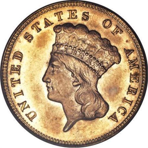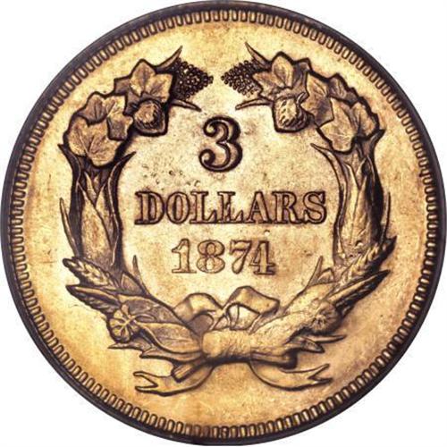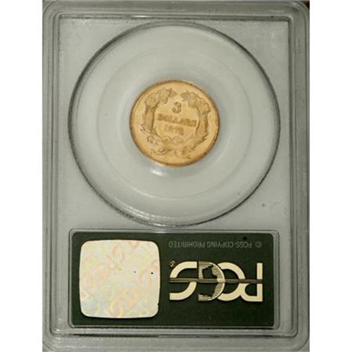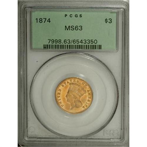 <B>1874 $3 MS63 PCGS.</B></I> The beautiful peach-gold toning is particularly rich across the obverse field. This lustrous gold type coin appears to grade higher at first glance, but a faint vertical mark on the cheek and a few ticks near DOLLARS appear upon thorough study. Housed in a green label holder.<BR><BR><B>Coin Engraver:</B> James B. Longacre<BR><BR><b>Shipping:</b> Coins & Currency (<a target="_blank" href="http://www.heritageauctions.com/common/shipping.php">view shipping information</a>)