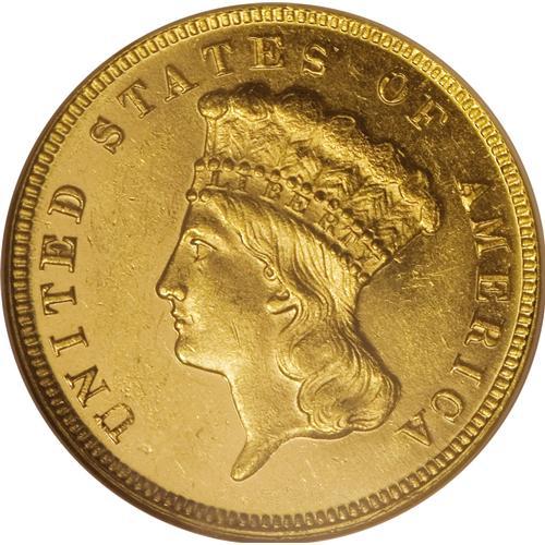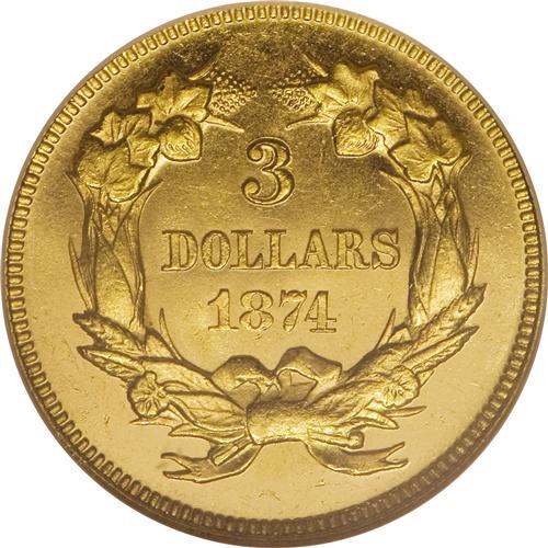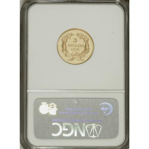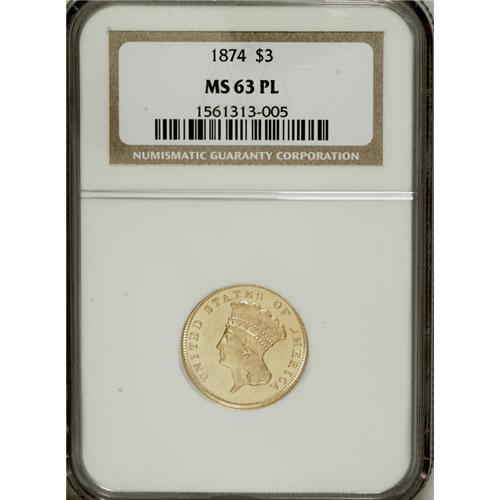 <B>1874 $3 MS63 Prooflike NGC.</B></I> Prooflike three dollar gold coins are extremely rare and seldom seen, constituting as they do a tiny minority of the certified population. While some issues from the 1870s forward show Prooflike-certified populations at NGC of up to 1% or 2%, some early issues in the series show Prooflike pieces forming only a small fraction of a percent of the Mint State pieces certified. In the case of the 1874, somewhat less than 1% of the pieces at NGC have earned the Prooflike designation. This piece boasts lovely yellow-gold surfaces with attractive black-on-gold contrast. A few faint field abrasions appear consistent with the Select grade. This is the only coin of the issue so certified at NGC, with no finer Prooflike specimens graded (4/07).<BR><BR><b>Shipping:</b> Coins & Currency (<a target="_blank" href="http://www.heritageauctions.com/common/shipping.php">view shipping information</a>)