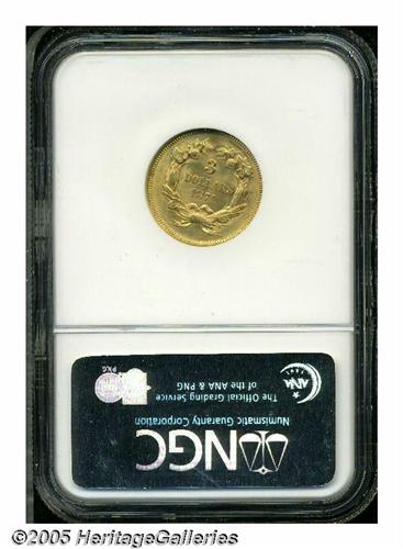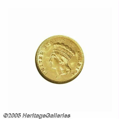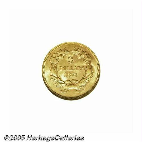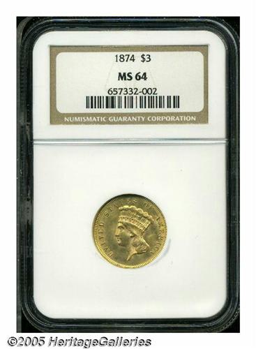 <B>1874<$3> MS64 NGC.</B></I> While this issue's original mintage of 41,800 pieces may seem low when viewed in the wider context of U.S. numismatics, it is one of the more obtainable Three Dollar gold pieces. A strong candidate for inclusion in a high grade type set, this frosty textured near-Gem shimmers with strong luster quality. Medium intensity yellow-gold color envelops generally bold, minimally abraded features.