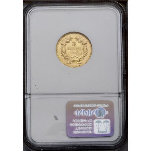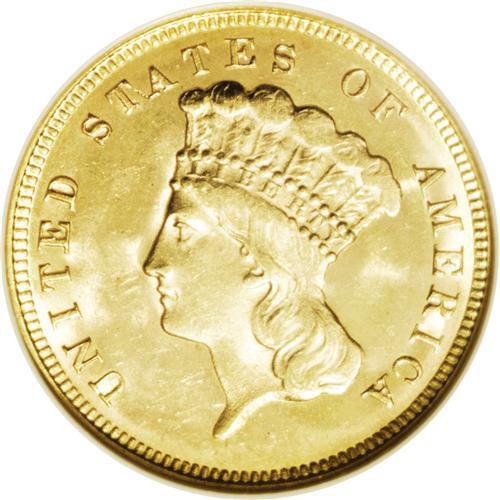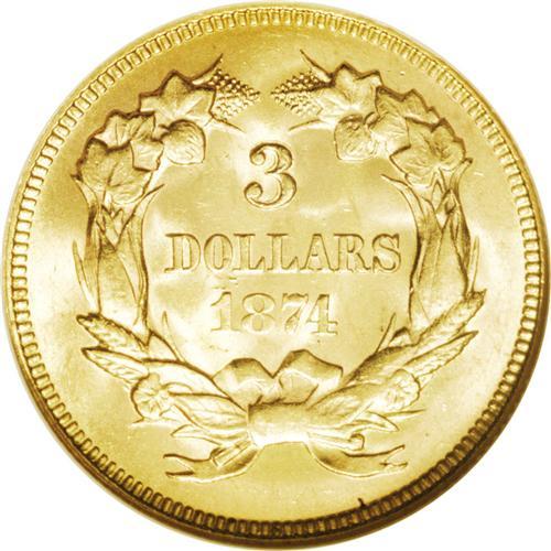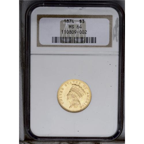 <B>1874<$3> MS64 NGC.</B></I> With so few pieces certified above the MS64 tier, the present piece combines desirability and affordability for the gold connoisseur. Thick and swirling, the luster falls somewhere between satiny and frosty classification. The sharply detailed surfaces carry a typical amount of abrasions to warrant the designated grade. Basically, the coin presents as yellow-gold, but a slight reddish tinge is detected as the coin turns under a light. A luminous, near-Gem example that would speak proudly of its new owner. Census: 62 in 64, 11 finer (3/06). <BR><BR><B>Important notice:</B> Heritage usually auctions material at the rate of 200-250 lots per hour. On some occasions eBay Live bid software or the Internet may not be able to keep up with the pace of the auction. We recommend placing a realistic absentee bid now as insurance to avoid disappointment. Occasionally the auctioneer may eliminate or reject an eBay Live bid, and the auctioneer may also reopen a lot after the close of the eBay live bidding (usually because we missed an audience bid), and may reject your bid even if it shows you as the winning bidder. By bidding via eBay Live, you agree that Heritage may award the lot to another bidder at its sole discretion under the circumstances described above or any other reasonable circumstances. Since eBay bids are not shown to us until we open the lot on the floor, we treat those bids just like floor bids. In most cases the floor responds before the eBay bid is presented to us, due to Internet lag time, so for consistency we have made it a policy that floor bids are always considered first over tie eBay live bids. Also please note that all Heritage lots purchased through eBay Live carry a 20% Buyer's Premium. Please make sure you read the Terms and Conditions before you bid. This lot is being auctioned in conjunction with a live floor auction by Heritage Galleries & Auctioneers. All final auction and invoice information will be supplied by Heritage Galleries & Auctioneers, and all other information should be considered preliminary. Lot:2591 <BR><BR><B>Winning Notification and Billing:</B> After the FINAL session in this auction is complete, Heritage will send e-mail and snail mail invoices. This process normally takes several days. All final auction and invoice information will be supplied by Heritage Galleries & Auctioneers, and all other information should be considered preliminary. <BR><BR>This auction will be conducted on a live auction floor and over the Internet through eBay Live. If you choose to place an absentee bid, please take a moment to <font color='#0000ff'><u><a href='http://pages.ebay.com/liveauctions/help/before/laabsentee.html'>learn how eBay Live absentee bidding works</a></u></font><font color='#000000'>