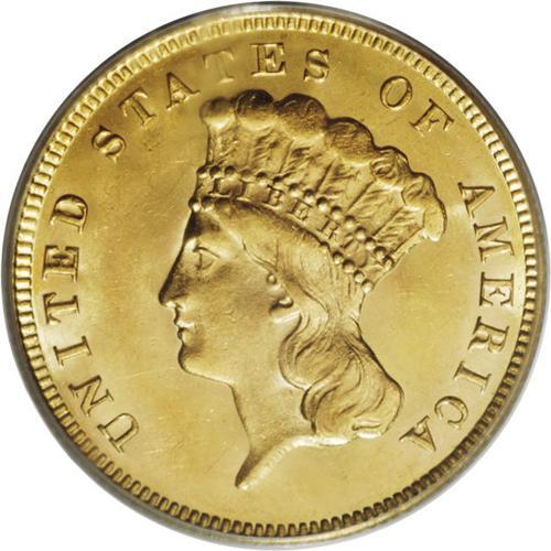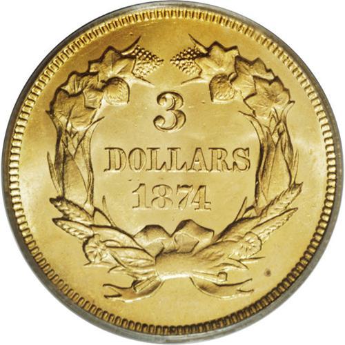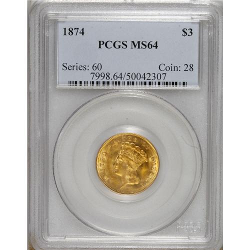 <B>1874 $3 MS64 PCGS.</B></I> The 1873 three dollar is plentiful today, coming from a business strike mintage of 41,800 coins. Population/census figures show that most extant examples are in AU and Mint State grades. The current MS64 specimen exhibits swirling luster emanating from peach-gold surfaces, the design elements of which have been subjected to a solid strike. Some minor softness is noted in Liberty's highest hair strands, and on the reverse bowknot, which is typical for the issue. A few minute handling marks preclude a higher grade. Population: 77 in 64, 12 finer (4/07).<BR><BR><b>Shipping:</b> Coins & Currency (<a target="_blank" href="http://www.heritageauctions.com/common/shipping.php">view shipping information</a>)