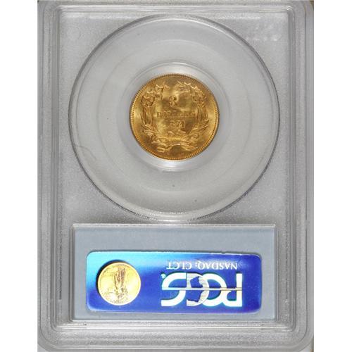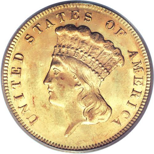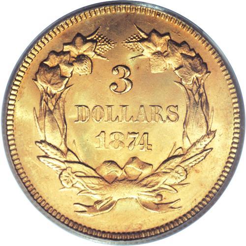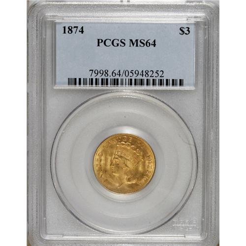 <B>1874 $3 MS64 PCGS.</B></I> The 1874 three dollar piece is relatively plentiful, coming from a business strike mintage of 41,800 coins. The certified population falls off somewhat at the near-Gem level. Potent luster is seen on this MS64 coin, graced with peach-gold coloration imprinted with whispers of light green. A fairly good strike is noted on the design elements, save for the usual weakness on the bowknot. Population: 77 in 64, 12 finer (3/07).<BR><BR><b>Shipping:</b> Coins & Currency (<a target="_blank" href="http://www.heritageauctions.com/common/shipping.php">view shipping information</a>)