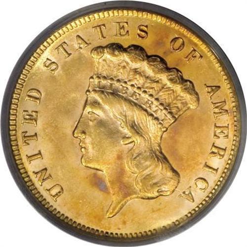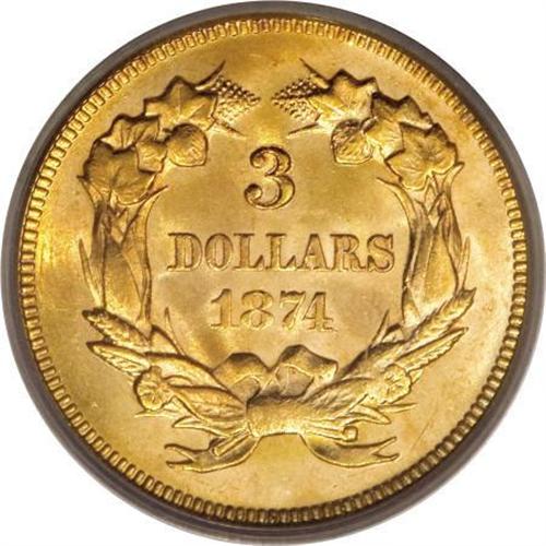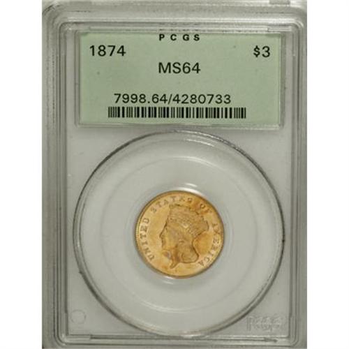 <B>1874 $3 MS64 PCGS.</B></I> A frosty and enticing near-Gem example of this popular type issue, yellow-gold at the margins with vibrant orange accents at the centers. Solidly struck with lovely luster and excellent eye appeal. Garrett and Guth (2006) note that while Choice pieces are available, Gems are conditionally rare and out of reach for the vast majority of collectors. PCGS has graded only 12 coins finer (10/07).<BR><BR><B>Coin Engraver:</B> James B. Longacre<BR><BR><b>Shipping:</b> Coins & Currency (<a target="_blank" href="http://www.heritageauctions.com/common/shipping.php">view shipping information</a>)