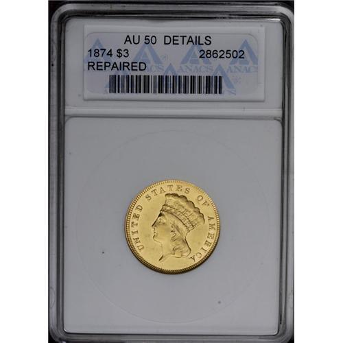 <B>1874<$3>--Repaired--ANACS. AU50 Details.</B></I> The obverse field has been smoothed, and exhibits fine hairlines. The reverse appears unimpaired. Substantial luster illuminates legends and devices. Liberty's hair has only slight wear.