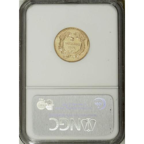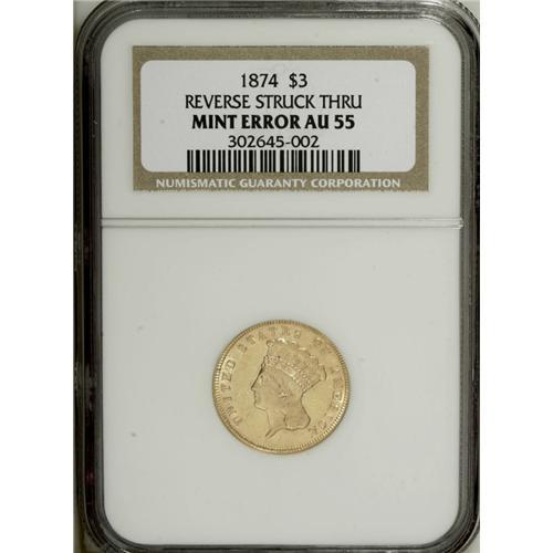 <B>1874 $3 --Reverse Strike-Through--AU55 NGC.</B></I> This pretty wheat-gold example retains ample luster. Well struck and lightly abraded overall with a strike-through (from the shape, possibly a splinter of wood) present near 3 o'clock on the reverse.<BR><BR><b>Shipping:</b> Coins & Currency (<a target="_blank" href="http://www.heritageauctions.com/common/shipping.php">view shipping information</a>)