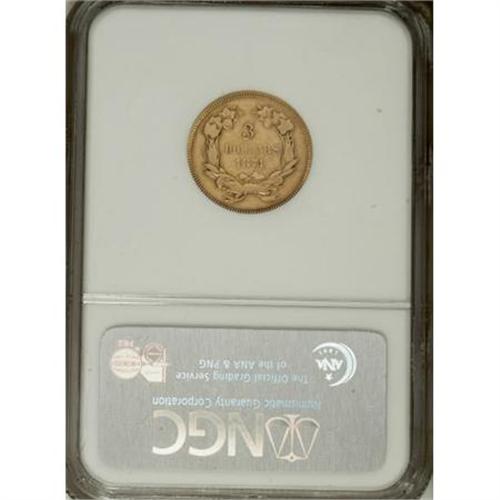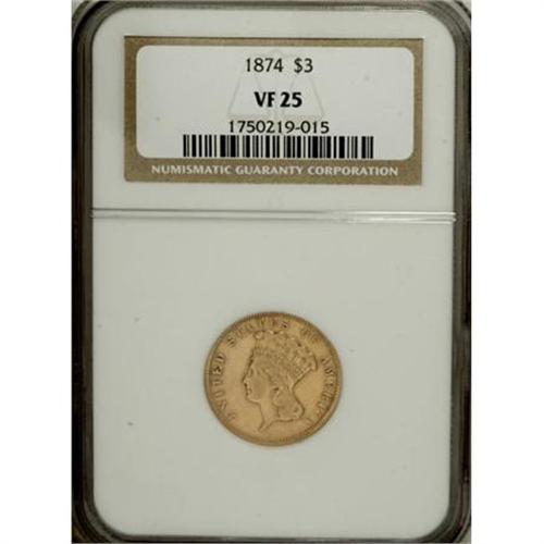 <B>1874 $3 VF25 NGC.</B></I> This is a moderately worn representative with faintly reddish-colored surfaces that are free of severe marks. Wispy hairlines are noted in the obverse and reverse fields. An affordable VF example of this readily available three dollar gold issue. <BR><BR><B>Coin Engraver:</B> James B. Longacre<BR><BR><b>Shipping:</b> Coins & Currency (<a target="_blank" href="http://www.heritageauctions.com/common/shipping.php">view shipping information</a>)