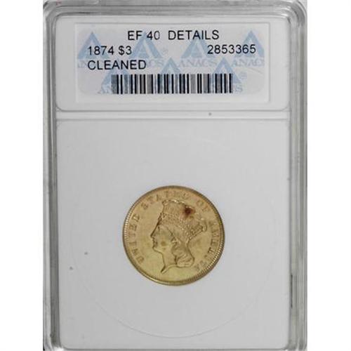 <B>1874 $3 --Cleaned--ANACS. XF40 Details.</B></I> NGC Census: (18/1893). PCGS Population (39/1546). Mintage: 41,820. Numismedia Wsl. Price for NGC/PCGS coin in XF40: $900. (#7998)<BR><BR><B>Coin Engraver:</B> James B. Longacre<BR><BR><b>Shipping:</b> Coins & Currency (<a target="_blank" href="http://www.heritageauctions.com/common/shipping.php">view shipping information</a>\)