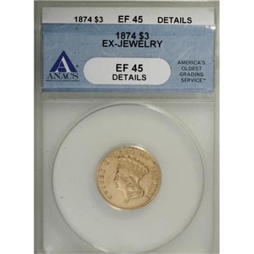 <B>1874 $3 --Ex-Jewelry--ANACS XF45 Details.</B></I> NGC Census: (53/1959). PCGS Population (111/1481). Mintage: 41,820. Numismedia Wsl. Price for NGC/PCGS coin in XF45: $1,090. (#7998)<BR><BR><B>Coin Engraver:</B> James B. Longacre<BR><BR><b>Shipping:</b> Coins & Currency (<a target="_blank" href="http://www.heritageauctions.com/common/shipping.php">view shipping information</a>)