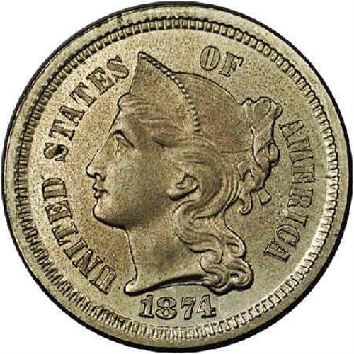 <B>1874<3CN>--Environmental Damage--NCS. Proof.</B></I> Gunmetal gray toning with pleasing gold and lilac iridescent highlights. Close examination reveals evidence of a uniform micro-porosity on both surfaces, something which may have resulted if the piece had been dipped in a cyanide solution many years ago. During parts of the 19th and 20th centuries, cyanide was used by some collectors to remove toning and oxidation from their numismatic treasures. In addition to damaging the coins, at least one celebrated numismatist of yesteryear, J. Sanford Saltus, is said to have died when he accidentally took a sip of cyanide instead of ginger ale, while he was cleaning some of his coins. Envelope Included.