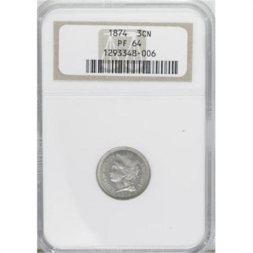 <B>1874 3CN PR64 NGC.</B></I> NGC Census: (75/122). PCGS Population (138/100). Mintage: 700. Numismedia Wsl. Price for NGC/PCGS coin in PR64: $380. (#3770)<BR><BR><b>Shipping:</b> Coins & Currency (<a target="_blank" href="http://www.heritageauctions.com/common/shipping.php">view shipping information</a>)