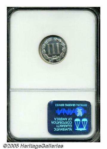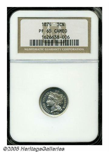 <B>1874<3CN> PR65 Cameo NGC.</B></I> The white on black contrast is undeniable, despite a whisper of tan color. A boldly struck and unperturbed specimen. Population: 13 in 65 Cameo, 20 finer (3/05).