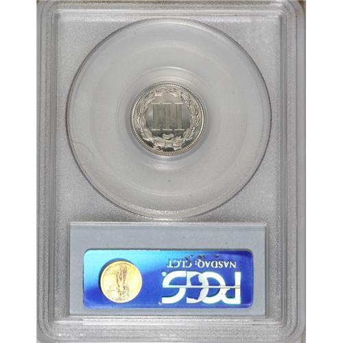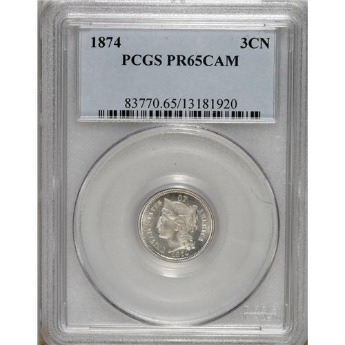 1874 3CN PR65 Cameo PCGS. A brilliant proof striking,