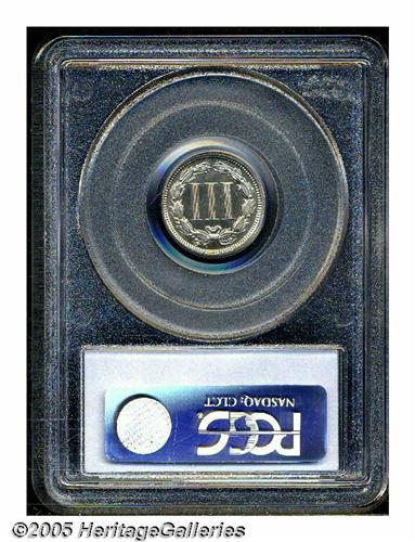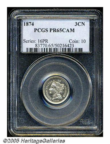<B>1874<3CN> PR65 Cameo PCGS.</B></I> Nicely reflective mirrors couple with the lightly frosted devices to produce appealing contrast on this slightly yellow-toned coin. A few minor planchet voids are noted for accuracy. Population: 13 in 65, 11 finer (6/05).