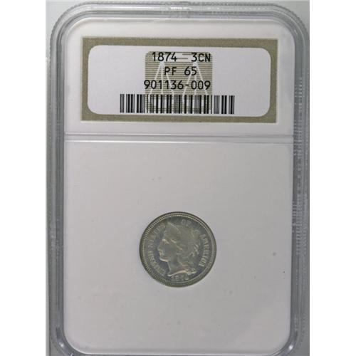 <B>1874 3CN PR65 NGC.</B></I> Moderately reflective with champagne toning and intermittent hazy patina on the reverse. The devices are boldly impressed on this lovely Gem.<BR><I>From The Jones Beach Collection.</B></I><BR><BR><b>Shipping:</b> Coin/Currency (<a target="_blank" href="http://www.heritageauctions.com/common/shipping.php">view shipping information</a>)