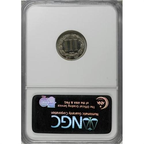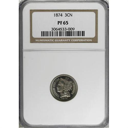 <B>1874 3CN PR65 NGC.</B></I> Delicate peach-gold and sky-blue toning graces both sides of this well-defined and shining Gem. This pleasing three cent nickel proof comes from the first issue in which the denomination did not have a silver counterpart. NGC has graded 24 finer specimens (8/07).<BR><BR><B>Coin Engraver:</B> James B. Longacre<BR><BR><b>Shipping:</b> Coins & Currency (<a target="_blank" href="http://www.heritageauctions.com/common/shipping.php">view shipping information</a>)