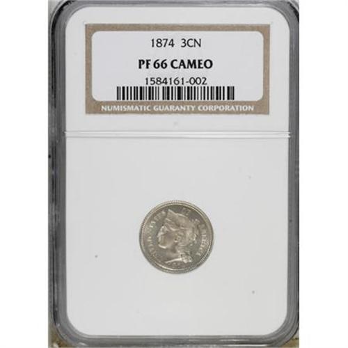<B>1874 3CN PR66 Cameo NGC.</B></I> This is a remarkable specimen that is markedly finer than the typically seen example of this issue. Stark cameo contrast is evident on both sides. The design elements are crisply and fully struck, and the surfaces are essentially pristine. Census: 23 in 66 Cameo, 5 finer (2/08). <BR><BR><b>Shipping:</b> Coins & Currency (<a target="_blank" href="http://www.heritageauctions.com/common/shipping.php">view shipping information</a>)
