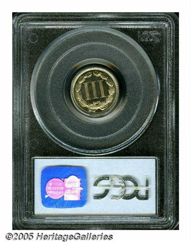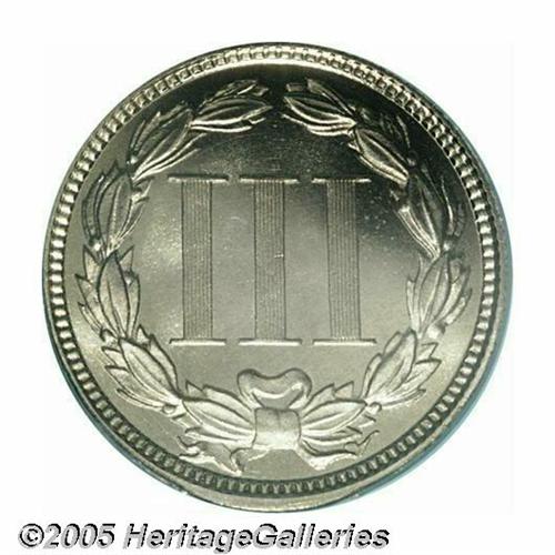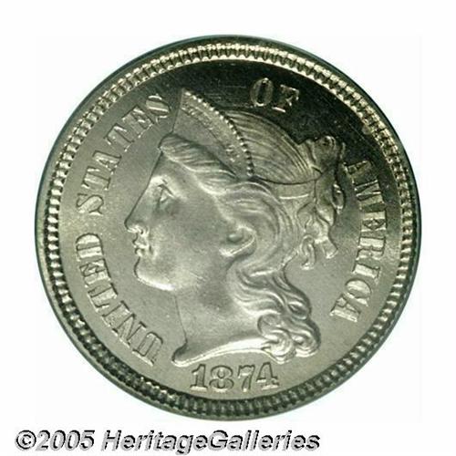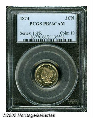 <B>1874<3CN> PR66 Cameo PCGS.</B></I> A brilliant Gem that has pleasing white on black contrast. The surfaces are exquisitely preserved, and have numerous parallel die polish lines. Well struck aside from BER in LIBERTY. Population: 11 in 66 as Cameo, with none finer (4/05).<BR><I>From The Western Hills Collection.</B></I>